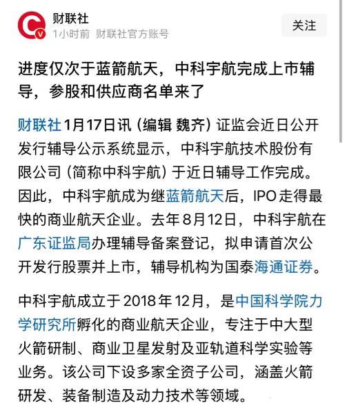 中科宇航完成上市辅导:夜深了,1月17日这个周末商业航天突发重磅利好消息,中科宇航完成上市辅导,这利好商业航天产业链!下周题材股如果率先反弹,那一定是商业航天会率先反弹。整体看,商业航天多数是国资,地方政府融资,国企融资,国家战略产业,2026年会是主线之一。如果商业航天都没行情,其他短线题材股就可以洗洗睡了,不少航天龙头股上周五已经开始放量了,说明有大资金抄底。有的个股已经下跌40%,从下周一开...