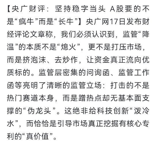白话就是散户们可以放心玩,就是涨的太快了,出手抑制一下,给市场降一降血压,不是让市场直接趴下,是有意引导资金去优质标的做长期投资和价值投资,而不是去疯狂的上头炒作,挤掉泡沫才能让市场更能良性健康的发展 直接点明了AI应用和商业航天是未来产业方向,不是一个炒作概念,反正就是一个意思,安抚你那内心的恐慌。#复盘记录##强势机会#...