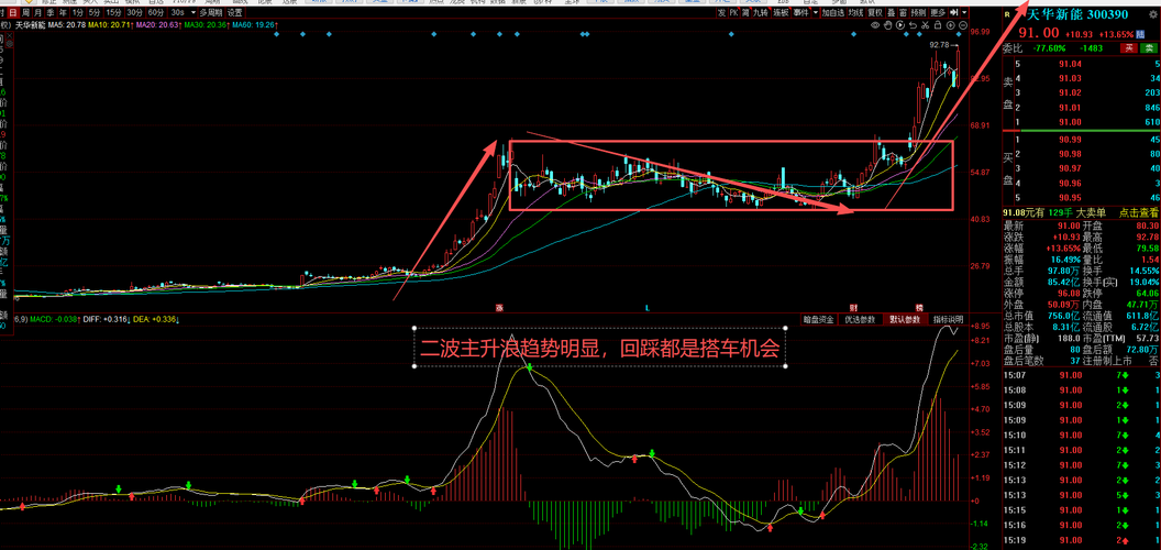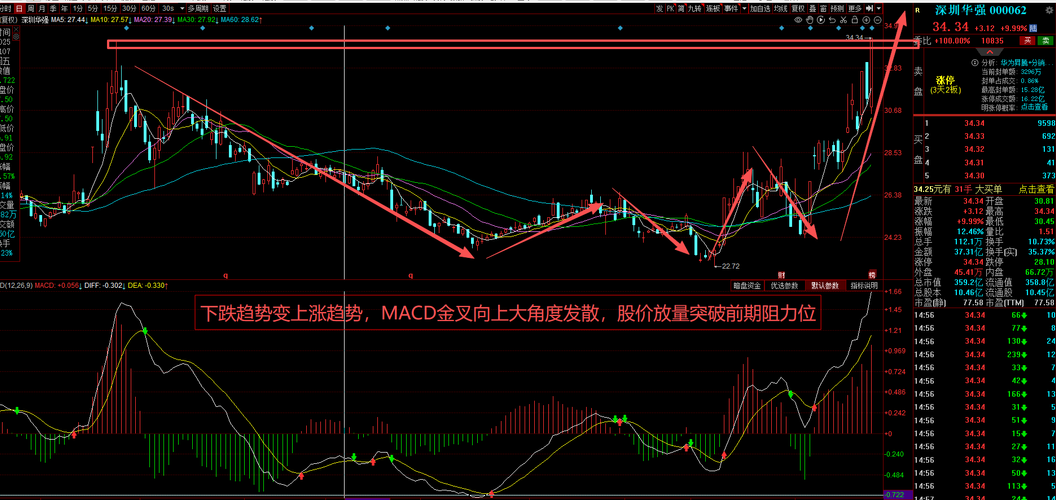 今日观察 $深圳华强(SZ000062)$ 下跌趋势逐步转变上涨趋势,MACD在0轴上大角度发散,上周五逆势涨停突破前期阻力位,3天2板太强了!一季报预增80%-120%,存储出货暴增,还是华为昇腾金牌伙伴,AI+存储双风口加持。放量37亿硬封板,不是散户炒作。技术面多头排列,突破平台,今天可以在33.5-34元低吸,目标37元,小仓试错,冲高不板就T,趋势不破就拿,辨识度拉满的潜力股! $天华新能(SZ300390)$...
