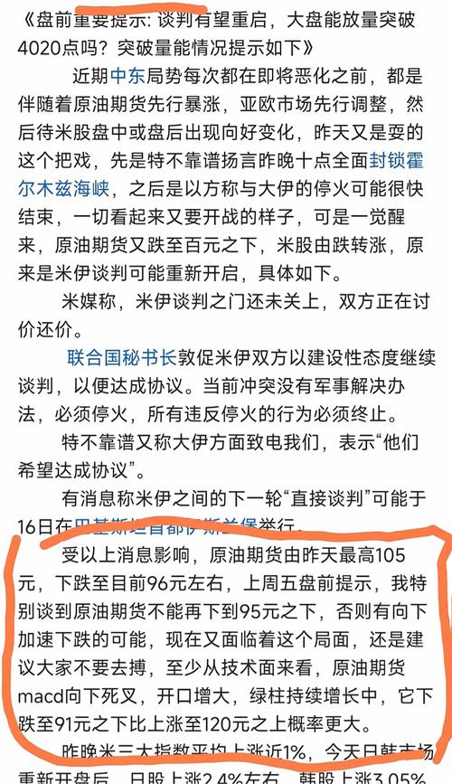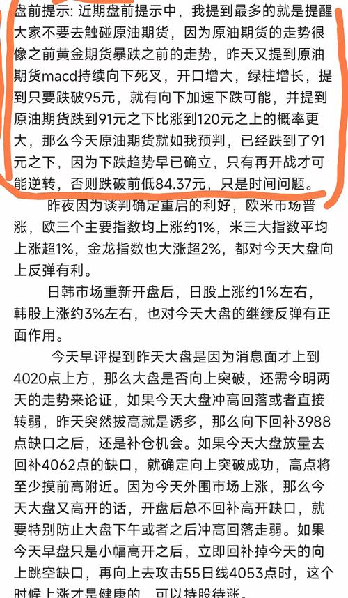 《周末杂谈:原油期货如期跌破前低84.37元,欧米市场应声上涨,大盘后市如何》 受霍尔木兹海峡彻底开放的利好消息,原油期货应声暴跌,已经跌破了前期低点84.37元,最低到78元才止跌反弹,这既是消息面的原因,更是技术面的要求,最近我多次提醒大家,不要去搏原油期货和石油类板块,特别提到原油期货的走势和黄金期货暴跌之前的走势相似,macd向下死叉开口增大,绿柱增长,明确指出原油期货跌到95元之下,将可...