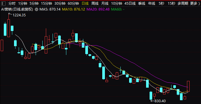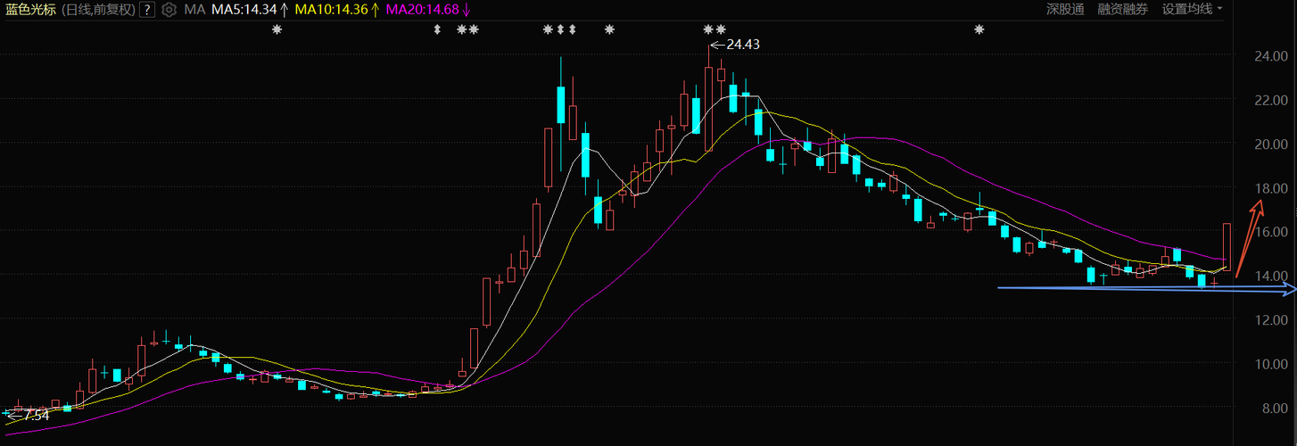 蓝色光标:昨天的明星股了,一根大阳线,直接上穿所有均线,买盘非常强劲,上午10:31即封住20%涨停,封板后未打开,做多意愿坚决。走出一根实体极长的,光头光脚超大阳线,表明多方力量占据绝对主导,光标在经历前几日的震荡整理后,今日一举突破前期震荡区间,形成看涨吞没形态。量能方面,今日成交额高达90.3亿元,成交量显著放大,是前几日的数倍,属于典型的“放量上涨”,验证了上涨的有效性。这还是反弹的第一天...