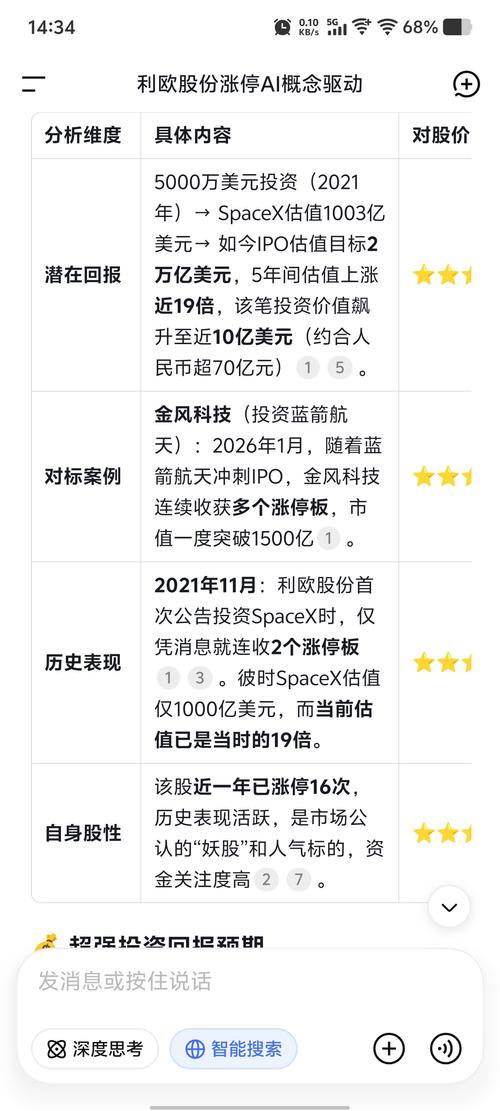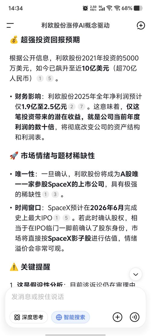 $利欧股份(SZ002131)$如果利欧股份公告确认持有SpaceX股权,这将是重大利好,预计会引发连续涨停。参考历史案例和市场情绪,保守估计可能在5-10个涨停板,甚至更多。 具体的推算依据和逻辑如下: 核心测算逻辑 分析维度具体内容对股价的推动力 潜在回报5000万美元投资(2021年)→SpaceX估值1003亿美元→如今IPO估值目标2万亿美元,5年间估值上涨近19倍,该笔投资价值飙升至近...