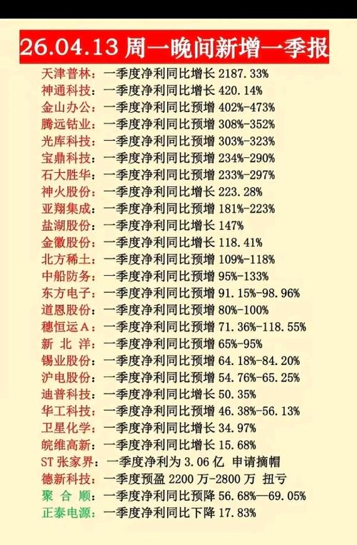 最高暴增2187%!4月13日晚间一季报密集出炉,九成标的预喜! 最新4月13日周一晚间A股新增披露的一季报业绩公告,整体呈现“高增为主、分化明显”的格局。本次披露的28家公司中,24家实现业绩同比正增长,2家实现扭亏/摘帽,仅2家业绩同比下滑,最高同比增速达2187.33%。高增标的集中于有色金属、新能源、AI产业链、电子制造等高景气赛道,同时覆盖船舶、电力、化工等多个领域,全面反映出一季度各行...