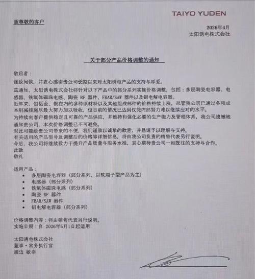 $顺络电子(SZ002138)$ 刚刚,太诱宣布涨价! 刚刚,太阳诱电发布关于部分产品价格调整的通知。 适用产品: ·多层陶瓷电容器(部分系列,以软端子型产品为主) ·电感器(部分系列) ·铁氧体磁珠电感(部分系列) ·陶瓷RF器件 ·FBAR/SAW器件 ·铝电解电容器(部分系列) 价格调整内容:将由销售代表另行说明。 实施日期:自2026年5月1日起适用