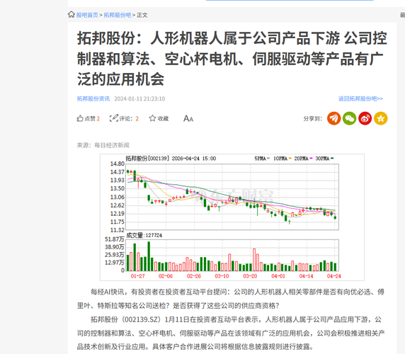 基于16张官方互动平台截图的全景记录 【前言】 本文所有信息均来自拓邦股份(002139)在深交所互动易平台的官方回复,经每日经济新闻、证券日报、上海证券报、读创等媒体转载报道。 第一阶段:技术亮相与坦诚定位(2024年1月) 2024年1月11日—人形机器人属于下游,控制器、电机有广泛应用机会 投资者提问:公司的人形机器人相关零部件是否有向优必选、傅里叶、特斯拉等知名公司送检? 公司回复:“人形...