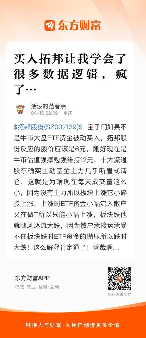 $拓邦股份(SZ002139)$宝子们如果不是牛市大盘ETF资金被动买入,拓邦股份反应的股价应该是6元,刚好现在是牛市估值强撑勉强维持12元,十大流通股东确实主动基金主力几乎断崖式清仓,这就是为啥现在每天成交量这么小,因为没有主力所以板块上涨它小碎步上涨,上涨时ETF资金小幅流入散户又在做T所以只能小幅上涨,板块跌他就随风逐流大跌,因为散户承接盘承受不住板块跌时ETF资金的抛压所以跌时大跌!这么解...