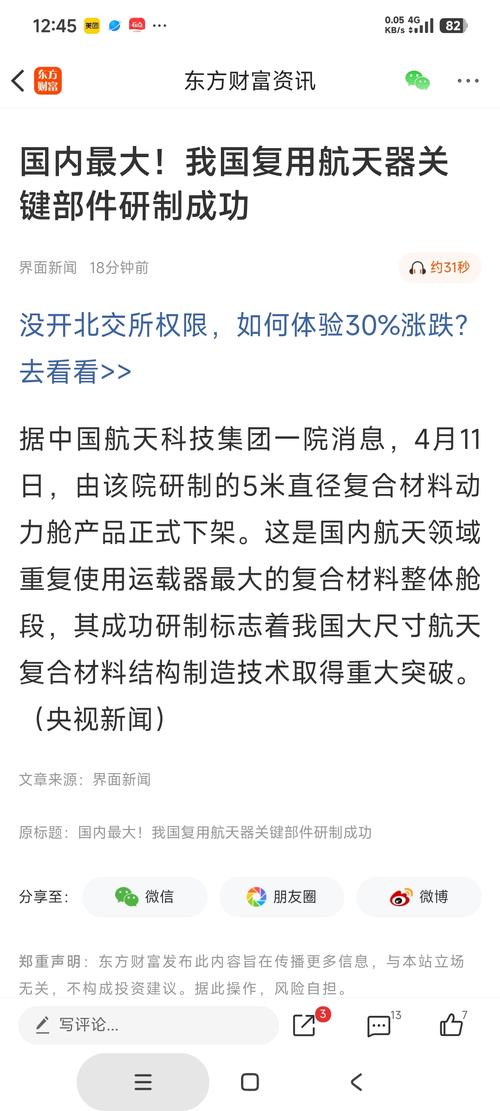 $西部材料(SZ002149)$跟你有关不?记者从中国航天科技集团一院获悉,4月11日,由该院研制的5米直径复合材料动力舱产品正式下架。这是国内航天领域重复使用运载器最大的复合材料整体舱段,其成功研制标志着我国大尺寸航天复合材料结构制造技术取得重大突破。