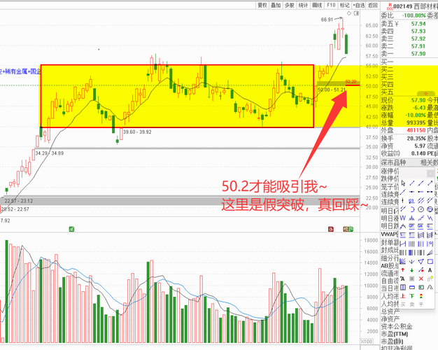晚间话西部材料:周五回顾与明日展望 周五回顾:早盘62.67元开,最高冲至63.00元,最低下探57.90元,最终收盘57.90元,下跌10.00%,单日振幅7.93%,股价全天运行区间集中在57.90-63.00元。全天成交量99.34万手,成交额59.12亿,换手率20.35%,量比1.04,资金活跃度较前一交易日回落;委比-100.00%,卖盘力量主导,内盘成交50.27万手,外盘成交49....