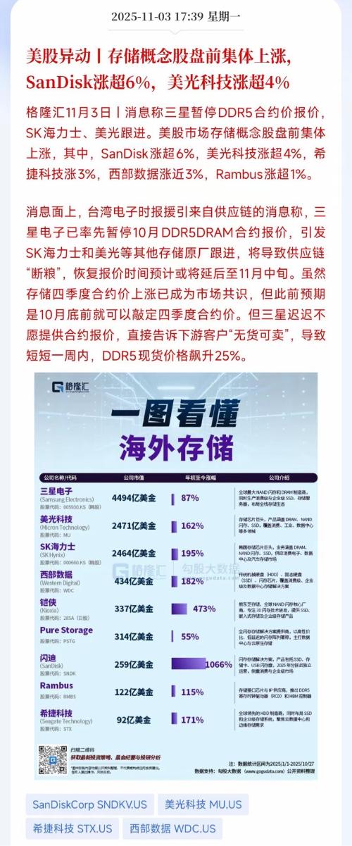 $通富微电(SZ002156)$明天储存芯片概念又要吊爆了,今晚美股先预演大涨特涨! 美股盘前存储芯片全面大涨,三星暂停了存储芯片的报价目的也是很明显,就是为了再次涨价,目前存储龙头美光和海力士也跟进了,这就导致本来因为人工智能发展而紧缺的存储芯片市场更加的稀缺,涨价也是必然的。#复盘记录#