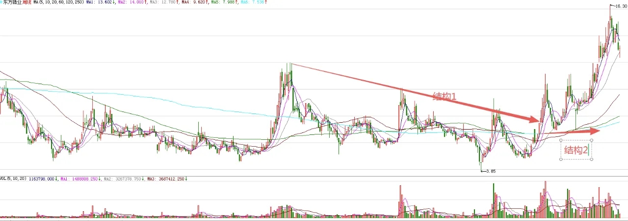 $东方锆业(SZ002167)$ 周线级别的走势来看,本周探底回升,到了日线级别的结构下轨,调整的空间到了。所以,本周探底回升的K线,释放了企稳信号。昨天出了业绩,下周初有调整,还会回踩,但是下周探底回升结束调整是大概率事件。图中标注的大型结构1突破,意味着股价处在比较大的上涨趋势。结构2是结构1突破后的回踩,意味着后期有波段上涨。近期的调整,是结构2突破后的回踩,是正常的调整。