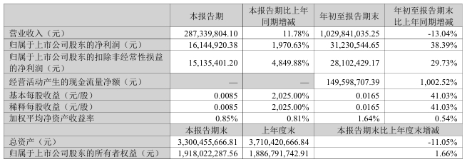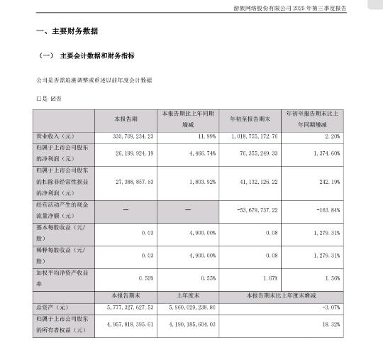 游族网络(002174.SZ)发布2025年三季度报告,该公司前三季度营业收入为1...游族网络(002174.SZ)发布2025年三季度报告,该公司前三季度营业收入为10.19亿元,同比增长2.20%。归属于上市公司股东的净利润为7635.52万元,同比增长1374.60%。归属于上市公司股东的扣除非经常性损益的净利润为4113.21万元,同比增长242.19%。基本每股收益为0.08元。