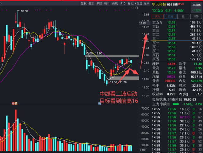 晚间话华天科技:今日回顾与明日展望 今日回顾:早盘12.70元开,最高冲至12.73元,最低下探12.34元,最终收盘12.55元,下跌1.65%,单日振幅3.06%,股价全天运行区间集中在12.34-12.73元。全天成交量92.37万手,成交额11.53亿,换手率2.83%,量比0.96,资金活跃度较前一交易日回落;委比-33.63%,卖盘力量占优,内盘成交53.46万手,外盘成交38.91万...