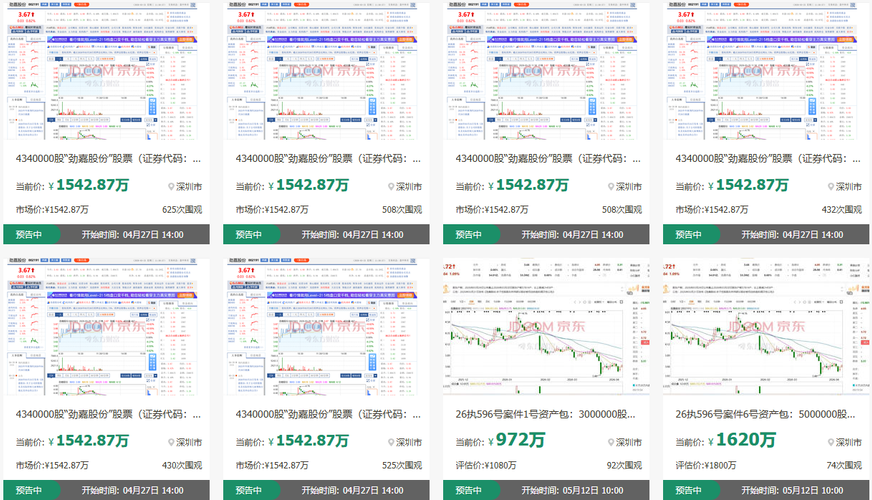 总计8440万股劲嘉股份股票上线京东资产交易平台,将于4月27日、5月12日陆续开拍。该批股票证券代码为002191,证券简称为劲嘉股份,股份性质为无限售流通股。处置机构分别为广东省深圳市中级人民法院、深圳市南山区人民法院。$劲嘉股份(SZ002191)$ 起拍价说明:本次涉案股票的网络司法拍卖的起拍价按照标的开拍日前20个交易日的收盘价的平均价乘以总股数再打九折为起拍价。上网挂拍至开拍前对外公示...