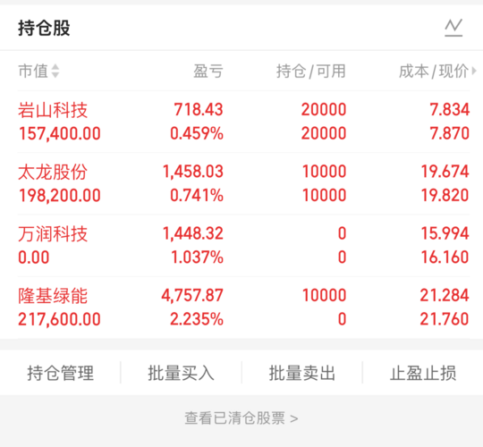 $岩山科技(SZ002195)$持股不动,短期预期偏轮动的方向。 $南方传媒(SH601900)$今天高开高走,上周五减了一部分,看能不能走出持续性吧。 $天赐材料(SZ002709)$上周连续涨了几天,本周调整,机会还有,中线逻辑不变,仓位重保守的可以做做减法,没有毛病! 【声明:本文所提到的投资观点仅代表个人的意见,所涉及标的不作推荐,据此买卖,风险自负。】