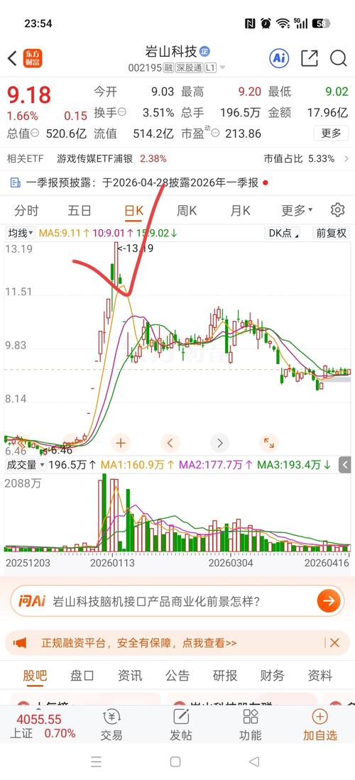 晚间话岩山科技:今日回顾与明日展望 今日回顾:早盘9.03元开,最高冲至9.20元,最低下探9.02元,最终收盘9.18元,上涨1.66%,单日振幅1.99%,股价全天运行区间集中在9.02-9.20元。全天成交量196.5万手,成交额17.96亿,换手率3.51%,量比1.23,资金活跃度较前一交易日有所提升;委比-41.62%,卖盘力量稍占优势,内盘成交78.80万手,外盘成交117.7万手。...