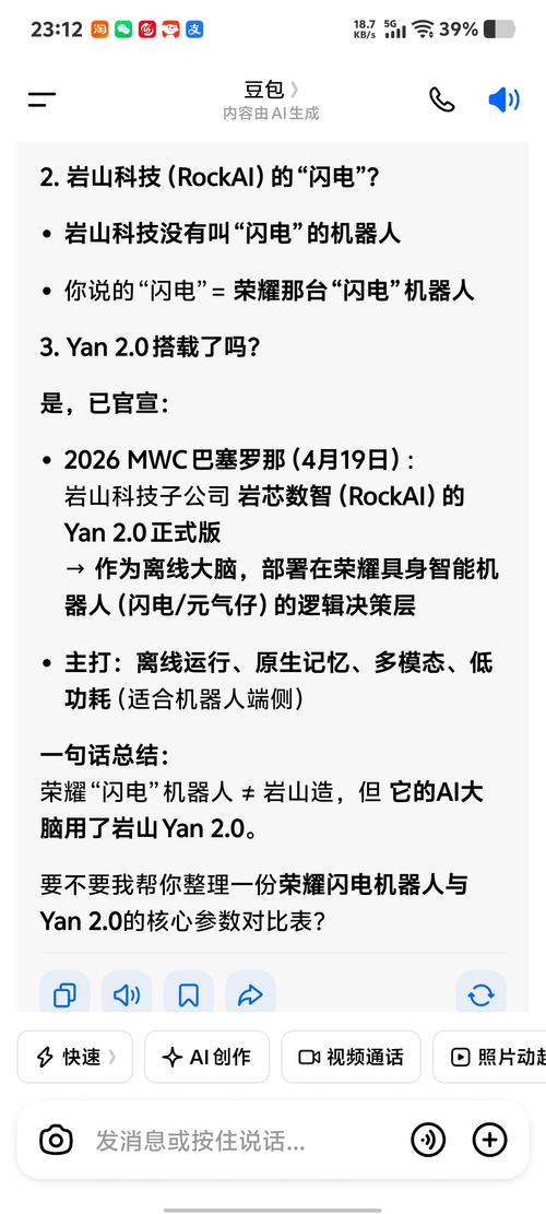 DeepSeek的答复: 这条关于“2026MWC现场演示荣耀机器人搭载Yan2.0离线大脑”的消息是真实的。 核心事实依据如下: ·合作官宣:在MWC2026现场,荣耀机器人明确标注“逻辑决策层采用Yan2.0架构”。岩芯数智(Yan2.0开发商)的母公司岩山科技也已确认此事。 ·能力分工:双方是深度合作关系——荣耀负责机器人的运动控制、硬件结构;岩芯数智则提供“AI大脑”,即逻辑决策、语音交互...