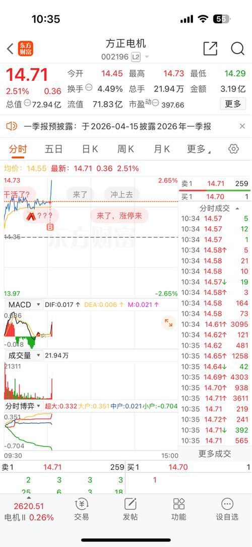 方正电机002196 方正电机是人形机器人关节电机核心标的,同时也是新能源汽车驱动电机的老牌玩家。方正电机今日个股助理资金持续流入,盘面资金支撑十分充足,最终以小幅收涨收官,全天维持红盘震荡整固走势,这一稳健走势也是对前期回暖趋势的进一步确认,个股趋势节奏愈发清晰稳固。当前人形机器人产业链量产进程持续提速,行业景气度不断攀升,后续板块也有望迎来持续回暖行情,赛道红利持续释放。对于这类趋势稳健、资金...