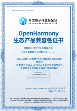 近日,深圳市证通电子股份有限公司(以下简称“证通”)旗下门诊多功能医疗自助终端、住院多功能壁挂终端,顺利通过OpenHarmony5.0.2Release版本的兼容性测评,获得由OpenAtomOpenHarmony项目群工作委员会颁发的《OpenHarmony生态产品兼容性证书》。标志着证通医疗终端在开源生态适配、跨设备协同能力上实现关键突破,以国产化技术与场景化落地深度融合的优势,为智慧医疗全...