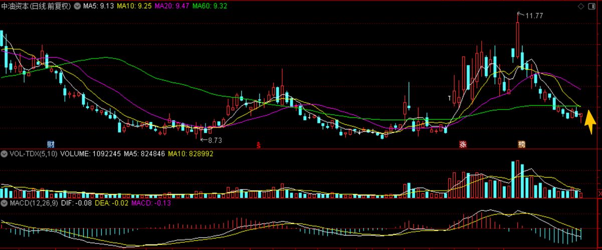 $中油资本(SZ000617)$中油资本,今天缩量小站,成交只有9.36亿,看空的力量衰竭了?行情要启动?还需要再2天的确认,记术上,这个票明天或者后天来一个带量的长阳线(成交金额大于19亿),就走出一个经典底部结构,同时形成一个记术上价站量增的良性关系。我们觉得短线震荡上行的可能性大,一方面它的一季报符合玉期,上站了22%,整体估值合理,记术上,谷价下碟到了一个趋势线的反弹点,中东关系题材、跨境...
