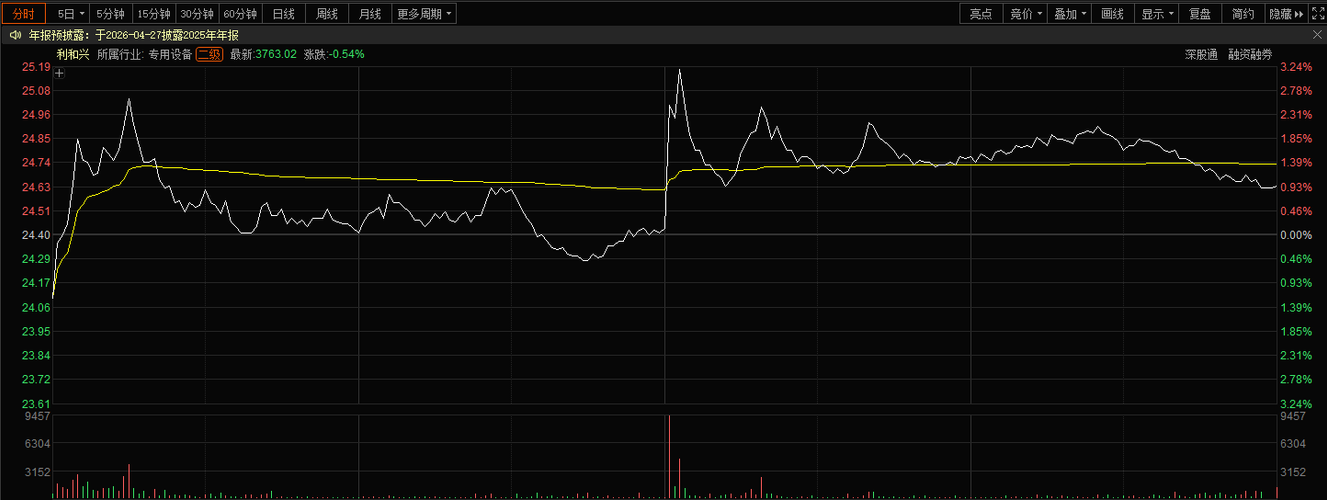 大家好,我是老猫,先赞后看,养成好习惯,多的不说,少的不唠,下面来看看我今日的持股跟解析。 $利和兴(SZ301013)$今日呈放量弱反弹格局,空头宣泄暂缓,但买方力量尚未形成有效集结,早盘以24.10元低开后震荡回升,盘中最高触及25.19元,此后震荡回落,最终报收24.63元,涨0.23元,涨幅0.94%。午后在GPT-5.5发布及机器人产业催化情绪带动下出现快速修复,5分钟内涨幅超2%,主动...