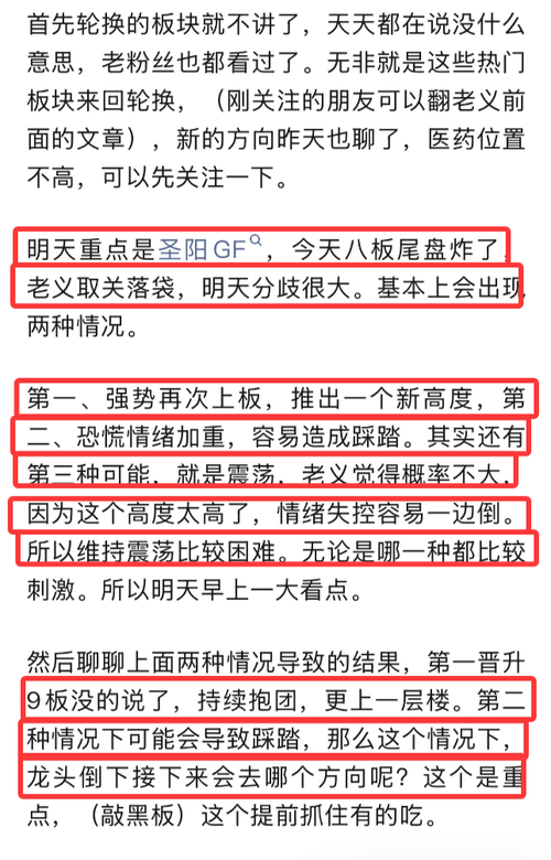 大家下午好,今天整体行情震荡,情绪上有些恐慌需要消化,前面一直震荡上行,今天适当的放缓脚步老义觉得是健康的,等这一波恐慌情绪消化科个差不多,还有向上空间,大家所以不用慌,今天这么走的导火索还是$圣阳股份(SZ002580)$昨天尾盘炸板老义拼手速出局,周五周末也多次说了,可能要拼手速,好在出局了。今天圣阳就躺板板了,带崩最近高标大涨的,整体陷入震荡。昨晚上也码字聊了今天的走势看法,提前考虑了一下圣...