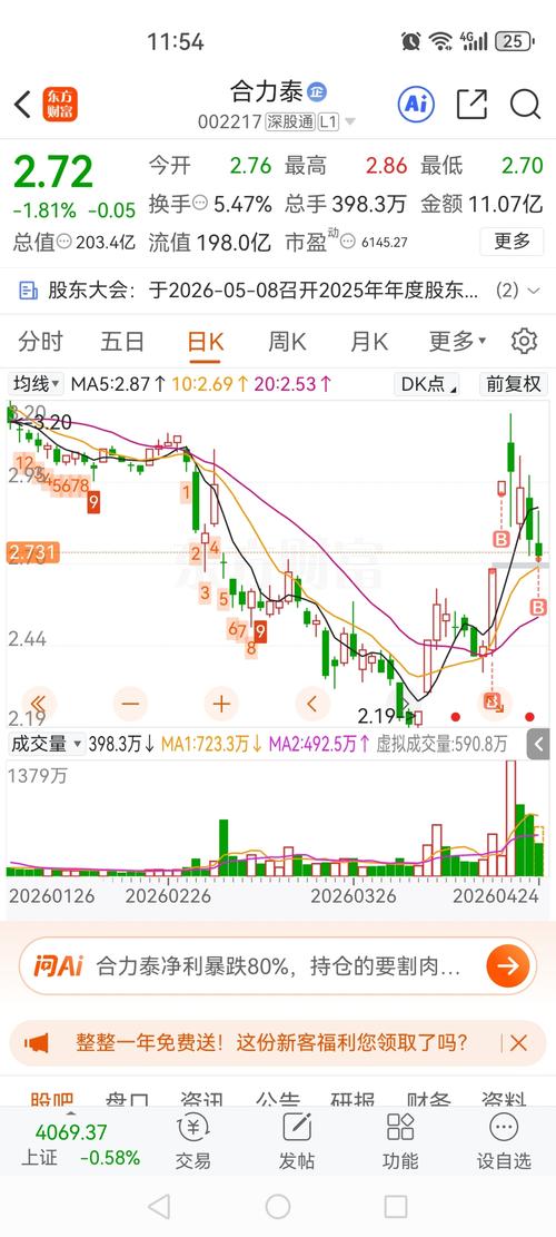 $合力泰(SZ002217)$ 合力泰:今日高开低走,主力出货意图明显,明日风险加剧 合力泰今日走出典型的高开低走大阴线,主力资金出货迹象明显,技术面与筹码分布均指向短期风险加剧,。。。。。 一、今日盘面特征:诱多后砸盘,主力出货意图明确 -高开低走,墓碑线形态:今日开盘2.90元,最高冲至2.97元,但随后一路震荡下行,最终收于2.77元,跌幅5.46%。K线图上形成一根长长的上影线,俗称“墓碑...
