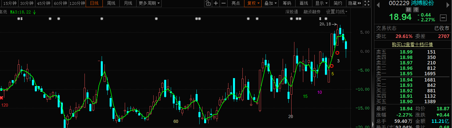 $鸿博股份(SZ002229)$还是之前说的、周线目前依旧在突破19分界线附近米窄幅整理、今天下探大周期MA5后反抽确认、换手12波段吸筹、导致大级别依旧上沿无序波动、次级别存在延续整理的可能、注意竞价的破坏、上面注意19.4的压力。下面注意18.5的支撑。等待变盘机会。#复盘记录#