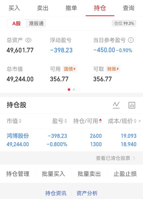 五万入市第二天 满仓鸿博股份 总资产49601.77元 今天早盘低吸了鸿博股份,因为我判断指数会探底回升,盘中也有机会做T,但是我认为没有太大必要,空间太少了,加上目前它已经连续三天走出阴线调整,有反弹的预期,所以选择直接持股,等待明天的反弹,今天已经回踩到了21日线附近,所以下跌的空间已经是非常有限了,明天是机会大于风险。 明日预期:看涨$鸿博股份(SZ002229)$