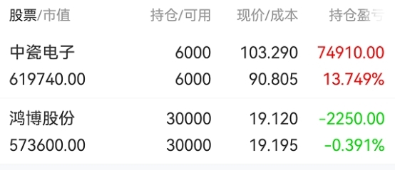 鸿博股份(印刷、算力、AI):昨天直接回落震荡,日线收根阴,又回到震荡向上的框架中,没能实现直接加速上去。没办法,哪有事事顺利,换个思路趴着了,留一手防守5日均线位置,穿下去我就麻溜放掉。$鸿博股份(SZ002229)$ 中瓷电子(光模块、通信):昨天也说过,收得确实难看。不过还在5日均线上,昨天量也不强,倒不至于直接走空,我预算着在5日均线这里再坚守一下,万一穿下去就放掉了。