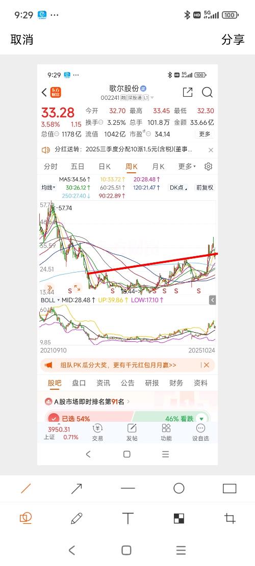 大盘震荡行情没有结束,还会继续震荡调整…我之前说过,歌尔股份我会在30左右补仓….这几天的回调,我歌尔股份31.7左右补了2000票,这2000票我是做T玩一下,准备等40再出,原有的仓位不变,等50以上再出。我一直都是满仓….我坚定看好牛市,虽然大盘会震荡,但是我也从来没让你们空仓或离场。牛市不会那么容易结束的,淡定持有等着就好。近期我只补仓了歌尔股份,其他的票没买没卖。2025.10.24