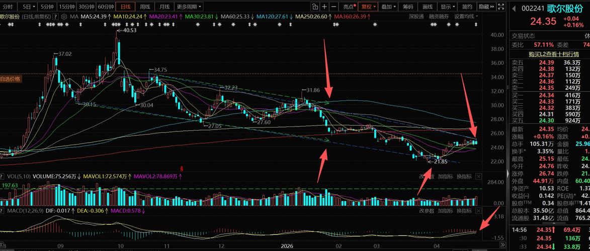 $歌尔股份(SZ002241)$ 就晒一张图吧,绿色趋势线是我2026年1月29日画的。蓝色趋势线是我今天画的。其他的不多说了。
