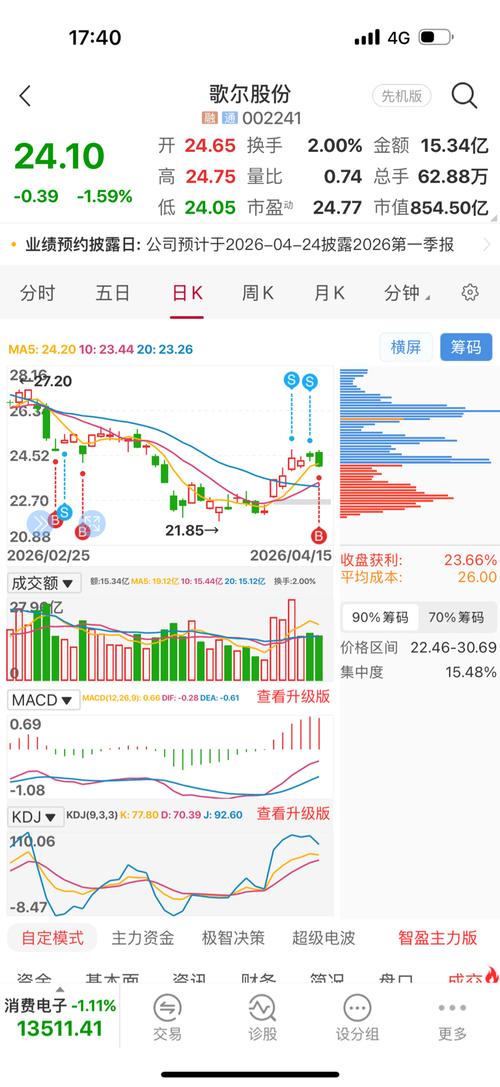 $歌尔股份(SZ002241)$今日直线下跌,量能却没有放出,今天属于洗盘,支撑位在23.92元,考虑后市风险暂且先清掉,,等支撑位是否能止住,或者明天直接企稳,再买进,,先空仓,,,