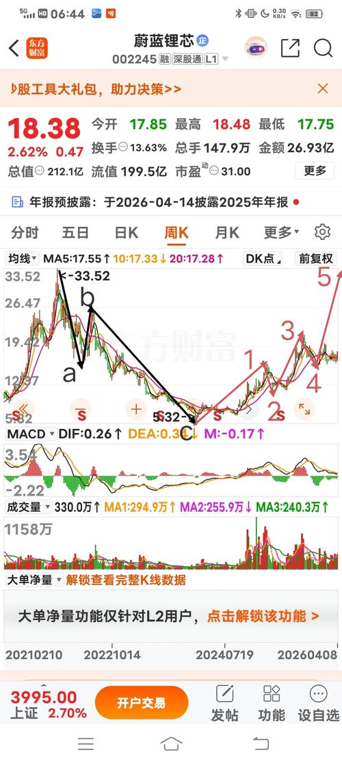 $蔚蓝锂芯(SZ002245)$ 一、公司基本面 公司属于电气设备板块,具有数据中心、MiniLED、芯片、固态电池、机器人、储能、锂电池、节能照明、创投等概念,主营业务:动力电池的生产、销售,LED外延片及芯片产品的生产和销售,金属材料的加工、销售等业务。三季报增82.05%,市盈率31.0倍,基本面良好。 二、走势浪型分析(前复权图形观察) 股价从历史高点下跌,呈a浪下跌、b浪反弹、c浪下跌走...