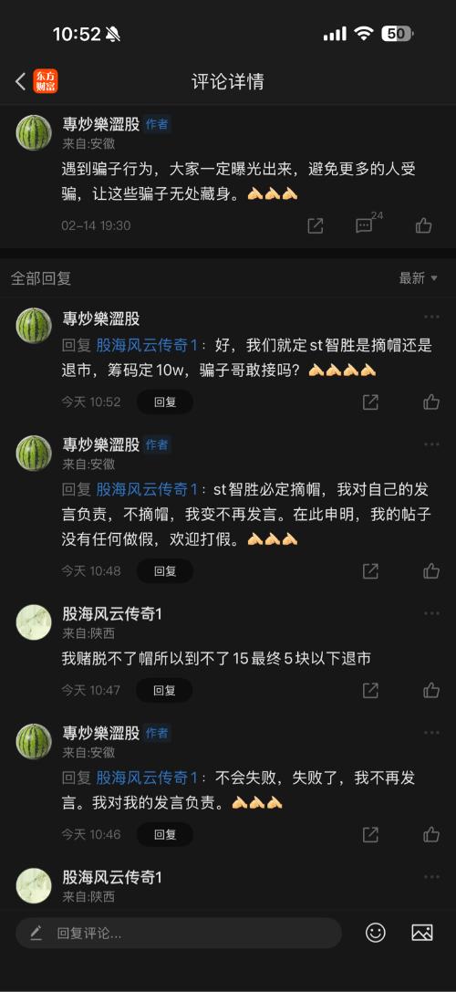$*ST智胜(SZ002253)$ @股海风云传奇1骗子哥和本人对于智胜是摘帽还是退市的约定如下。 欢迎所有兄弟们作见证。