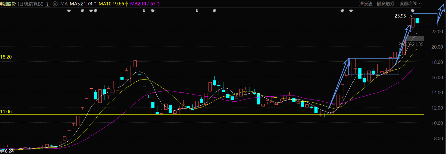 神剑股份都以为阴线就要回调了,如果这么想就错了,神剑股份昨天的承接比较强,早盘平开低走,价格虽然在零轴下方调整,但始终站在了22的支撑上,尾盘有明显修复,说明多方还在承接。神剑股份现在走完了第二波主升浪,第一波结束时价格调整了两周左右,那么这一波如果价格横盘调整,可能也有一周左右,这段时间会升和回菜,但是趋势它始终还是保持没有变,看雾日均线的支撑,后续商业航天还会有活跃,那么神剑作为中心就还会升。...