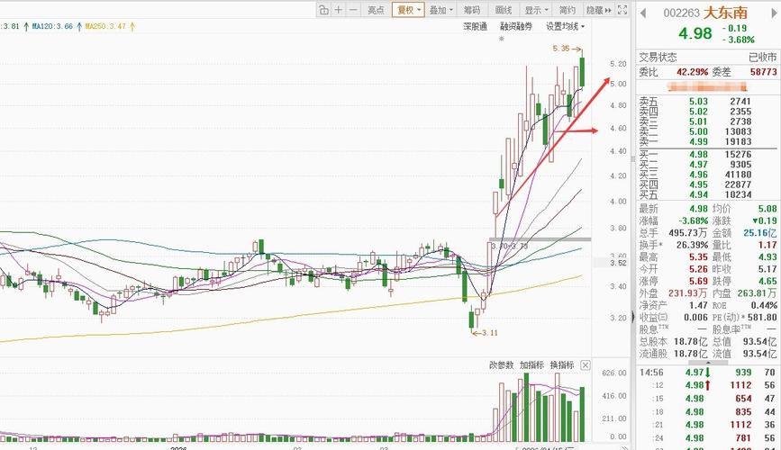 大东南$大东南(SZ002263)$:这票今天高开低走,冲高回落,收盘又跌到5均线位置。昨天刚涨停,今天直接被兑现,热度退得太快,场内分歧特别大。开盘冲得太快,抛压直接砸下来,量能放得特别大,换手超26%,筹码明显松动,我今天头铁没动,想着能回拉,结果尾盘没起色,心里有点慌。短期压力在5.1-5.2元,支撑看4.9元,跌破就得果断减仓,目前先拿着观察,问题不大,再给一天机会,不行就撤。 华工科技$华工科技(SZ000988)$...