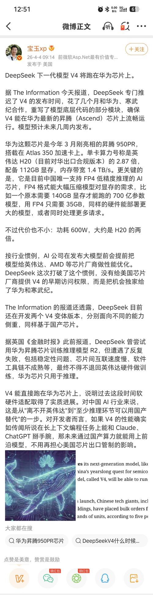 $泰嘉股份(SZ002843)$DeepSeek下一代模型V4将跑在华为芯片上。 据TheInformation今天报道,DeepSeek专门推迟了V4的发布时间,花了几个月和华为、寒武纪合作,重写了模型底层代码的部分模块,确保V4能在华为最新的昇腾(Ascend)芯片上流畅运行。模型预计未来几周内发布。 华为这颗芯片是今年3月刚亮相的昇腾950PR,搭载在Atlas350加速卡上。单卡算力号称是...