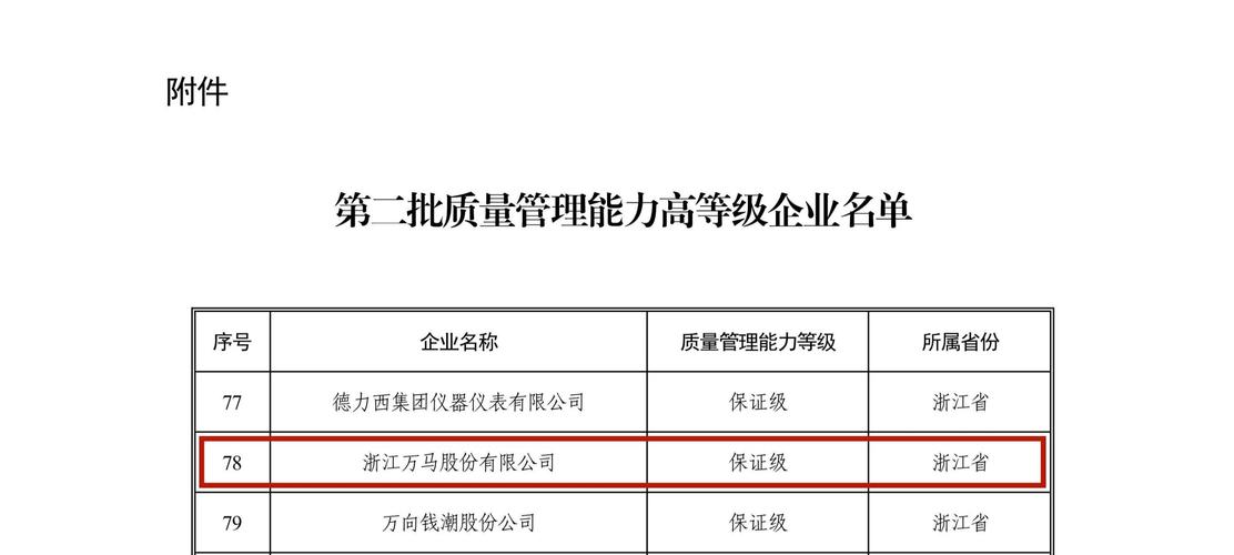 国家级认定!万马股份获评“质量管理能力高等级企业”。 近期,工信部公布第二批质量管理能力高等级企业名单。万马股份成功入围该项国家级荣誉榜单,获评“第二批质量管理能力高等级企业-保证级”。 本次权威认证,标志着万马股份质量管理水平跻身全国制造业第一梯队,为公司品牌形象与市场竞争力增添了重量级硬核背书,也是为全球化竞争与产业升级做铺垫布局。