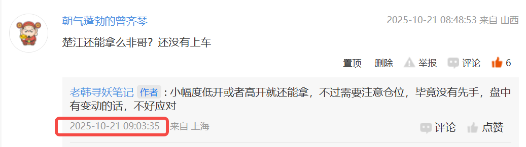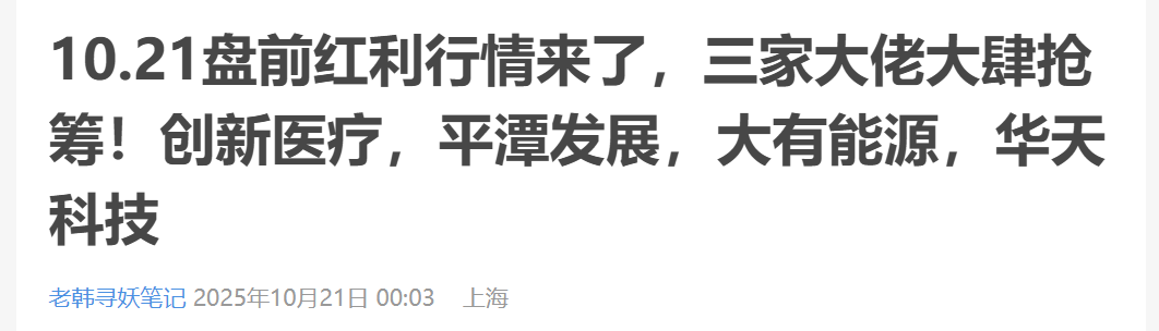 大盘形势 昨日全市场仅煤炭、燃气板块飘绿,这里燃气依然可以跟进,上证指数已经来到前期高点附近,明天还是交割日,再加上A股已经连涨2天,老韩提醒大家短期还是要注意一下未来几个交易日的风险,不要追涨杀跌。 早间观察 神开股份 随着深地经济站上风口,自然资源部十五五的推进,今天是顶一字了,这票也是个趋势票从924到现在一直走的趋势,上从那波7连板都没给他砸死,主力做多意愿太强了,昨天涨停位置,已经有四次...