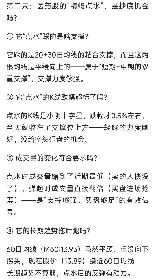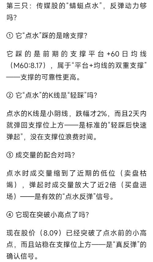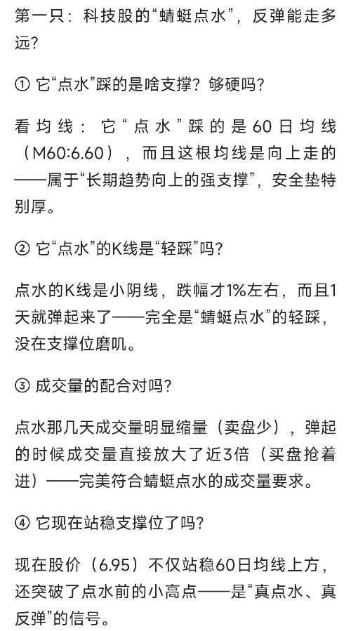 #社区牛人计划#$遥望科技(SZ002291)$$贝瑞基因(SZ000710)$$慈文传媒(SZ002343)$ 行情回调时总不敢下手?“蜻蜓点水”就是新手都能看懂的“轻踩支撑、马上反弹”信号——像蜻蜓点水一样“轻踩”关键支撑位,踩完就涨!今天把这形态拆到根儿上,再扒3只刚出这形态的股:每根K线、每笔成交量都是“涨的线索”! 先把“蜻蜓点水”拆透:5个...