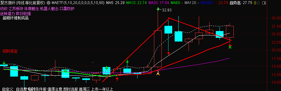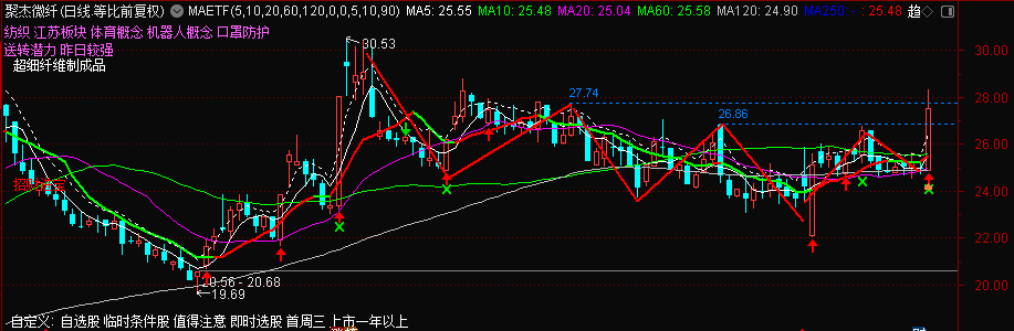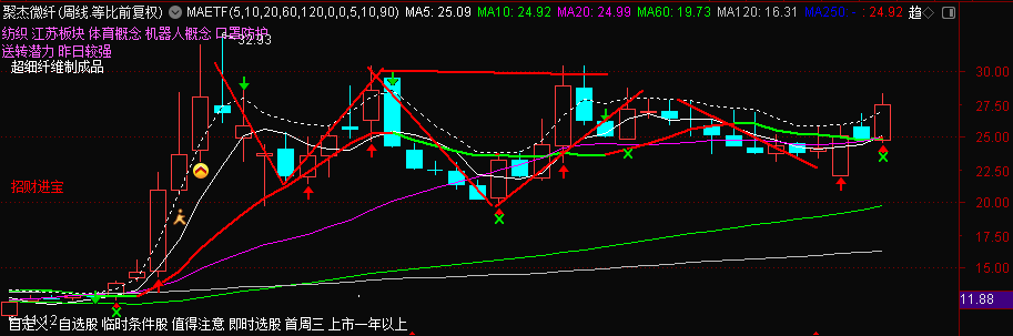 聚杰微纤(300819)月线蓄势10线6,周线双头+ABC到位;日线双头+ABC调整后双底起涨。