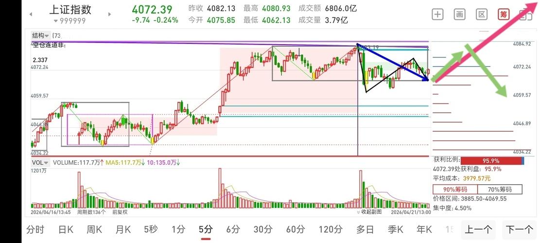 上证指数日K继续向上延伸,还会上涨吗?预期低开探底。谨防“30分钟走势出现背驰。” 日线观测上证指数没有盘背。趋势上会继续向上延伸,离压力位很近了。 30min走势这里出现了背驰,中枢向上延伸,ABC三段差第三段C的向下走势。这一段C的走势将决策上证指数未来几天超短线走势结构。 5分钟走势没有背驰,低开回踩中枢后继续向上遇见了压力位后回到30分钟结构,向下展开C段一笔。 “反复震荡向下低开后迅速拉...