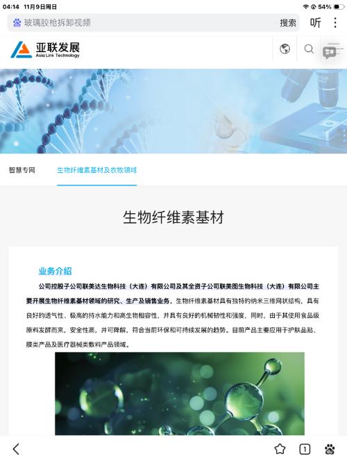 $亚联发展(SZ002316)$$星空华文(HK|06698)$$上海建工(SH600170)$ 业务介绍 公司控股子公司联美达生物科技(大连)有限公司及其全资子公司联美图生物科技(大连)有限公司主要开展生物纤维素基材领域的研究、生产及销售业务。生物纤维素基材具有独特的纳米三维网状结构,具有良好的透气性、极高的持水能力和高生物相容性,并具有良好的机械韧性和强度,同时,由于其使用食品级原料发酵而来,...