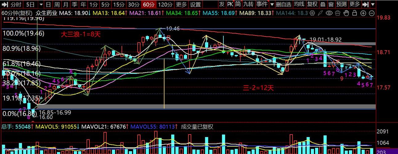 众生,大三浪2子浪调整中。4月14号18.21和18.06两次买入建仓,次日开始上涨还在得意,16-17又连跌2天,肯定又是波浪数错了。大周期,25年11月的高点27.97是大一浪结束,26年3月低点16.60大二浪结束,刚刚好大一浪涨幅回退了68.2%。3月24号开始大三浪,8天完成第1子浪,以为14号第2子浪结束,现在看来19.25高点才开始走c段,要到下周二才能完成了。 老在“中原大叔”的帖...