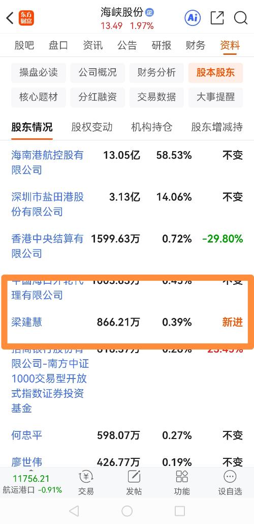 $海南高速(SZ000886)$ 西岐红牛10-2623:09·江苏居民理财资金进入股市成为历史必然,也远未结束!>海峡股份13.49+1.97%$海峡股份(SZ002320)$ 梁建慧是一位较为知名的个人投资者,也被称为“牛散”。 根据公开信息,截至2025年6月30日,梁建慧持有海峡股份866.2万股,占比0.39%,为新进股东,当时的流通市值约为5665万元[__LINK_ICON]。同时,...