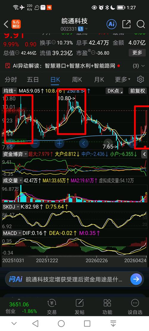 - 皖通科技能否横有多长竖有多高? 这个取决于,题材,资金面和技术面合力 首先技术面要具备, 其次题材一定要正 这样可以吸引更多资金来参与, 从走势形态看?皖通科技盘子比较小,可能是庄家控盘股。还有走势经常涨停后没有延续性,整体就是涨停很快见顶回调,涨停溢价上涨冲高回落,后面就是回调,这样不仅庄家控盘感觉,还有量化投机感觉,后面我们进一步深度挖掘分析一下,看看有没有确定性的大机会。 我们不是为了捉妖股,是为了抄底,抓趋势转折,做趋势,波段,越是涨停多长周期横盘的?就越有可能趋势转折,在抄底过程?无意间他趋势波段大涨,并且有的时候可能短期龙头股,甚至短线第一龙头妖股。当然成为第一龙头妖股?一般有些条件,可能是热点题材,可能是戴维斯双击业绩突然反转,可能重做,借壳。否则第一龙头妖股可能很小,趋势波段上涨有可能。 要成为牛股?一般要热点题材切换时候,挖掘低位涨停反复涨停股,有很多次涨停基因,但是日日周月线技术面又是处于低位超卖状态,出现了放量涨停,如果有龙虎榜也最好有机构,机构资金一般很有可能做中长线,也最好有外资,还有一线游资存在。那么要挖掘,这样个股?需要深度去研究,贴合前提要求下没有挖掘到妖股,也可能挖掘到波段牛股 $皖通科技(SZ002331)$$DeepSeek概念(BK1188)$