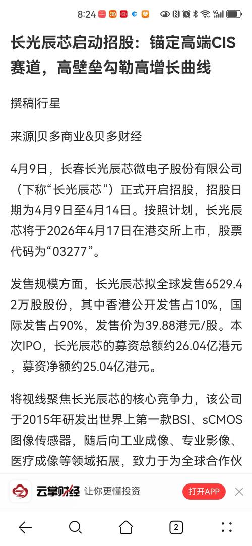 $奥普光电(SZ002338)$港股新股打新:长光辰芯03277.HK——国内第一、全球第三的CIS龙头,长光辰芯 基本情况: 申购时间:4月9日-4月14日,15号出结果,16号暗盘,17号上市; 发行价格:39.88 入场费:4028.23 1手:100股 全球发售:6529.42万股 公开发售:652.95万股 公开发行手数:65295手 基石:有,27家基石投资者认购49.95%份额 绿鞋...