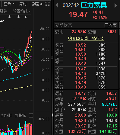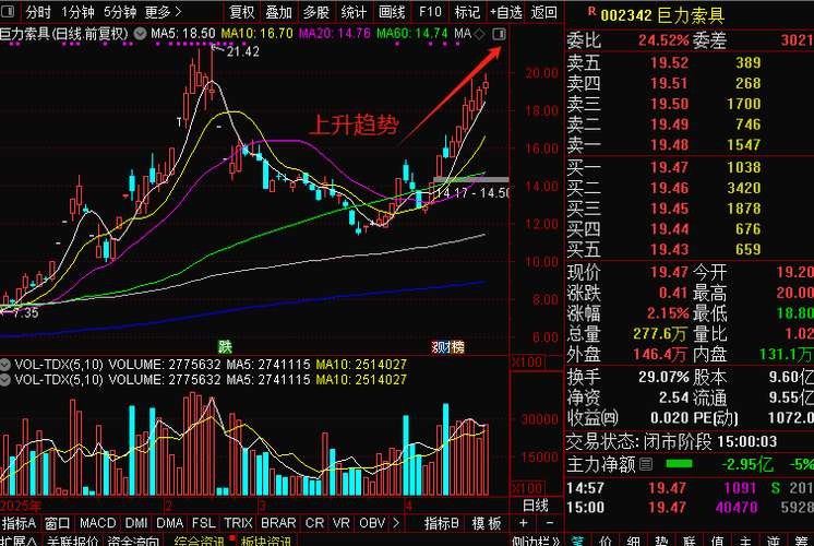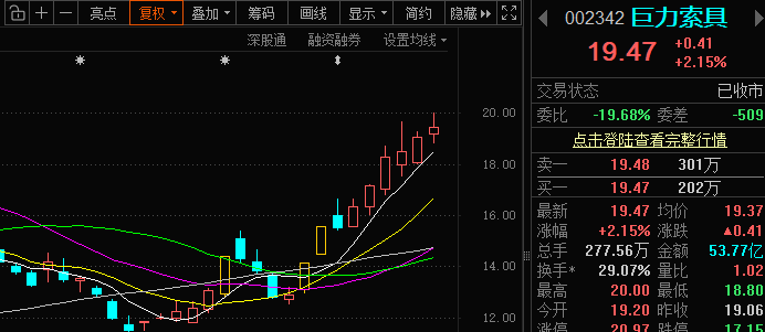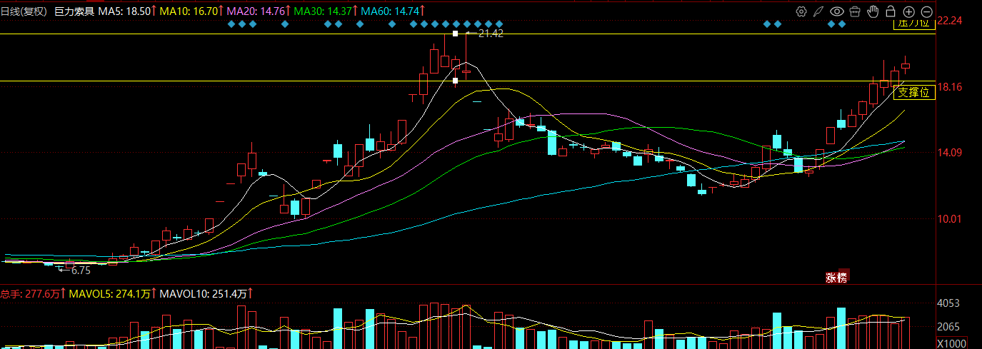 巨力索具002342 巨力索具昨日依旧靠着5日均线稳稳往上走,涨幅不算大,但走得是真稳,一路沿均线爬,韧性拉满,盘里看着像资金流出,其实就是连阳后获利盘正常兑现,压根不用慌。公司是商业航天的核心配套标的,产业一直发酵,赛道支撑足得很,走的就是稳扎稳打的路子。现在稳步向上的趋势已经定型,今日还会延续这个节奏,依托均线慢慢往前期高点21.42靠拢。这股走的是慢牛节奏,不用急着求大阳线,趋势牢得很,顺势...