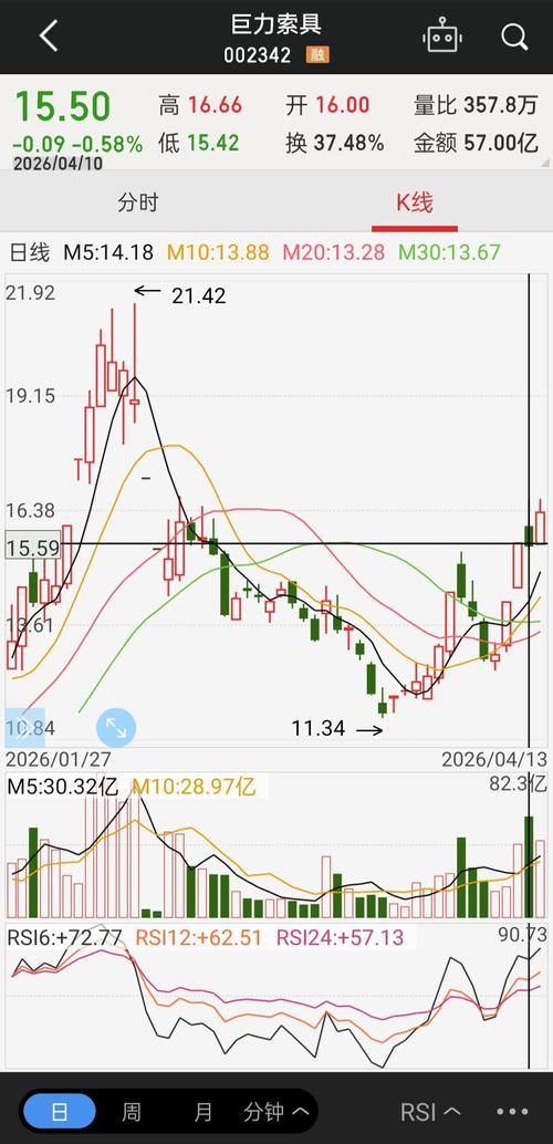 $巨力索具(SZ002342)$ 巨力索具,从技术图形上看,走得相当扎实,4月8日一根阳线直接穿过了五条均线,属于典型的强势启动信号,随后股价一直沿着5日线稳步攀升,量能保持活跃,高位承接有力,没有出现明显的抛压松动。年报显示,营收25.7亿元,同比增长超16%,净利润1743万元,彻底扭亏为盈,为近期的反抽奠定基础。日线级别和60分钟级别都出现了看涨信号,形成共振,只要不跌破5日均线,中期向上的...