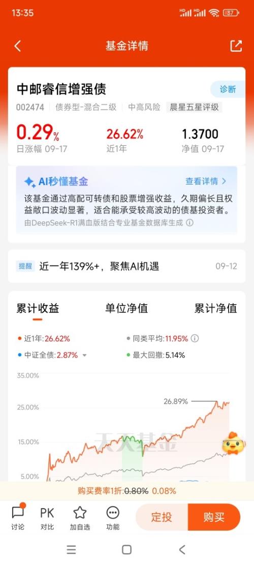 纯债收益越来越低,权益上涨信号清晰,$中邮睿信增强债$可关注,主投信用债+可转债+股票,回撤控制绝佳,昨天还下了29个蛋呢。